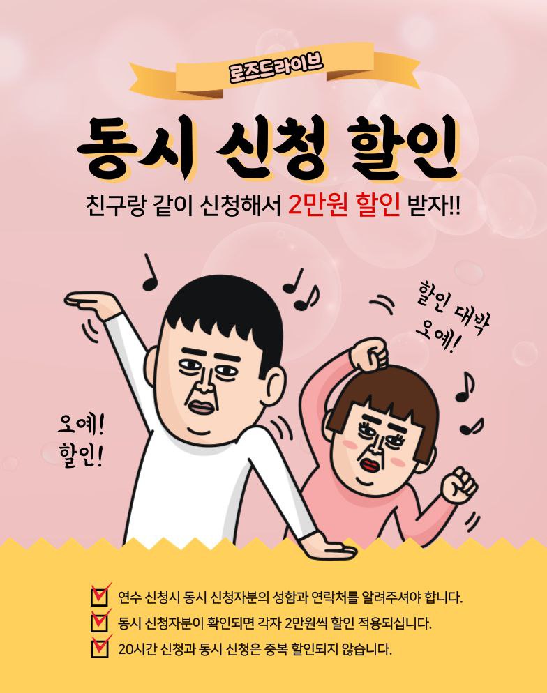동시 신청 할인 이벤트 안내 친구나 가족과 동시에 신청하면 한분당 2만원씩 할인해드립니다두분 모두 연수..